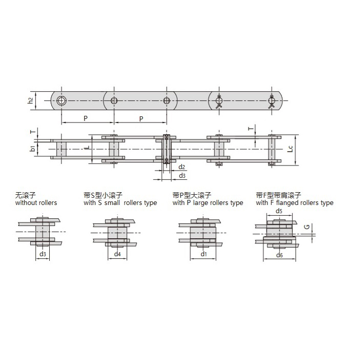 - Velký válec typu P:Průměr válečku přesahuje výšku spojovací desky, vhodný pro střední a malé horizontální nebo šikmé dopravní linky.
